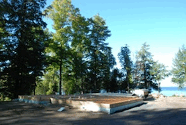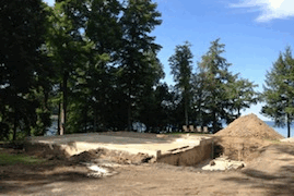 The north elevation seen from the waterfront with the cedar facade accented by a stone chimney.
