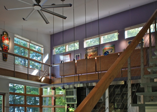 View of the entry to the the living area with gas fireplace, stone bench and chimney. In the foreground: the main stair made of stainless steel with wood and and glass treads.